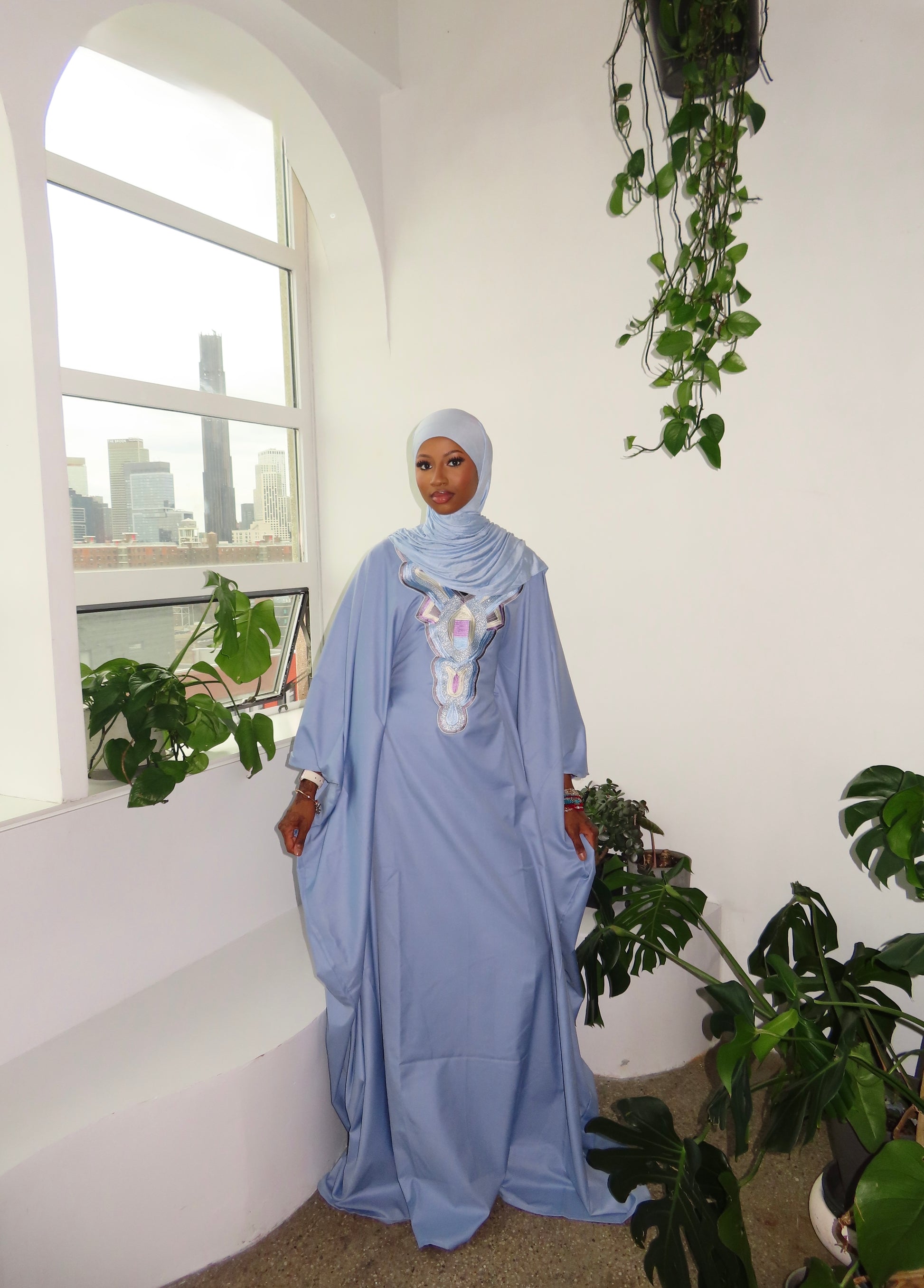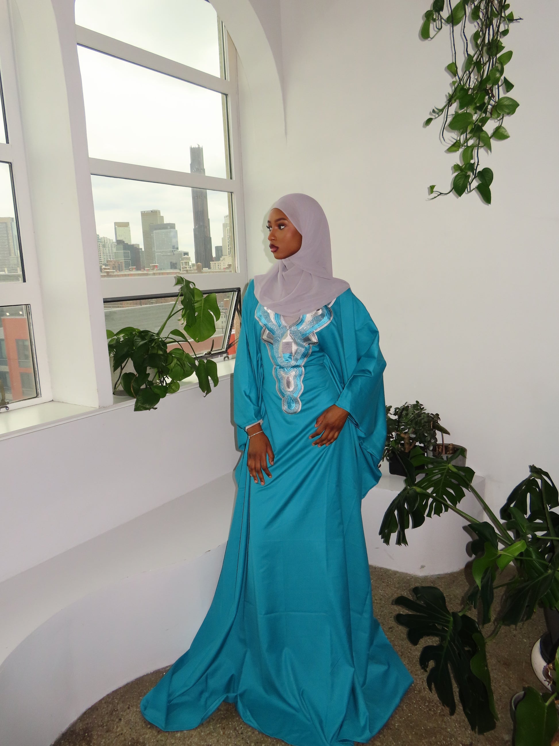 The flowing silhouette drapes beautifully, creating a modest refined look perfect for special occasions or everyday elegance.